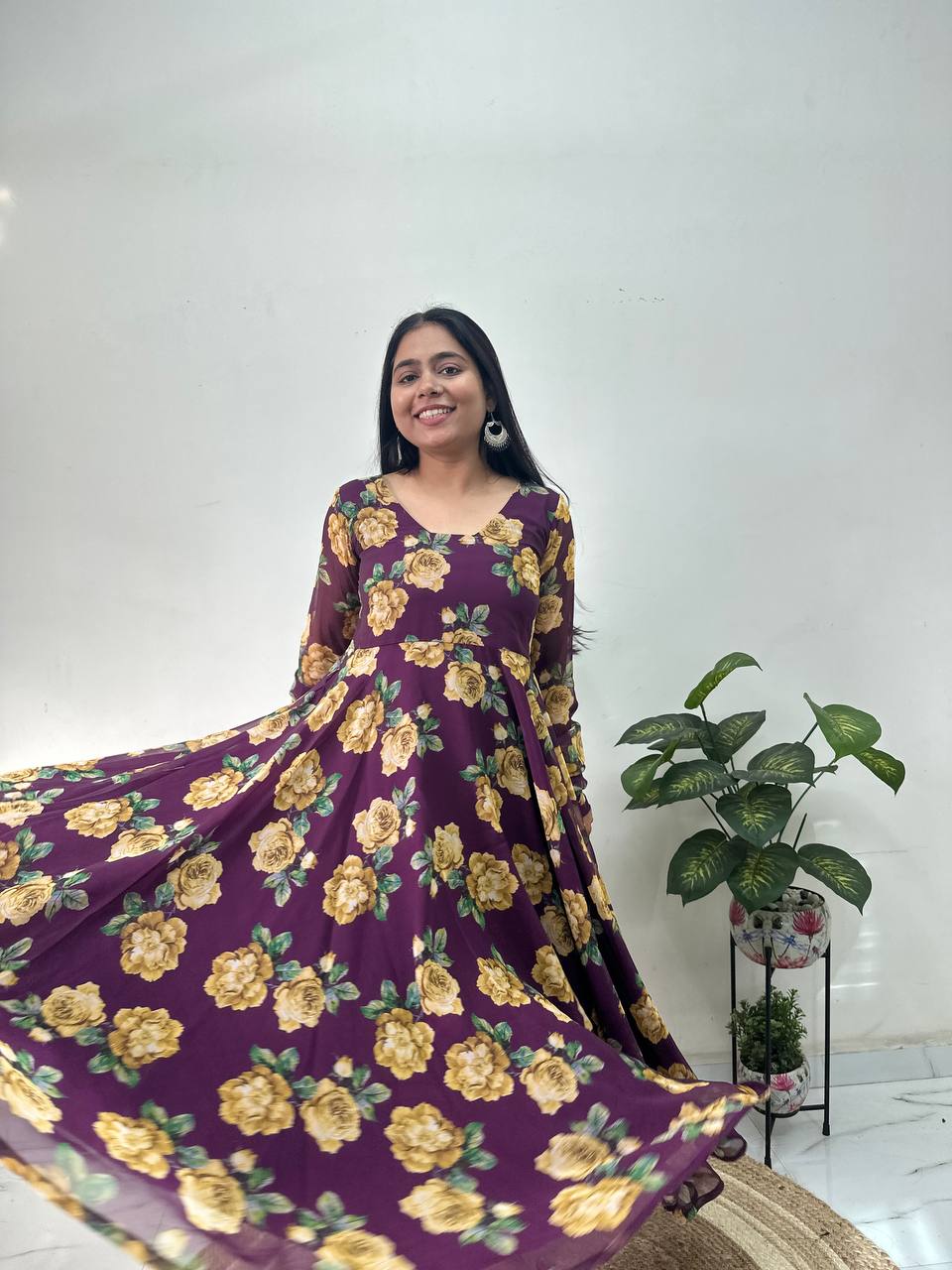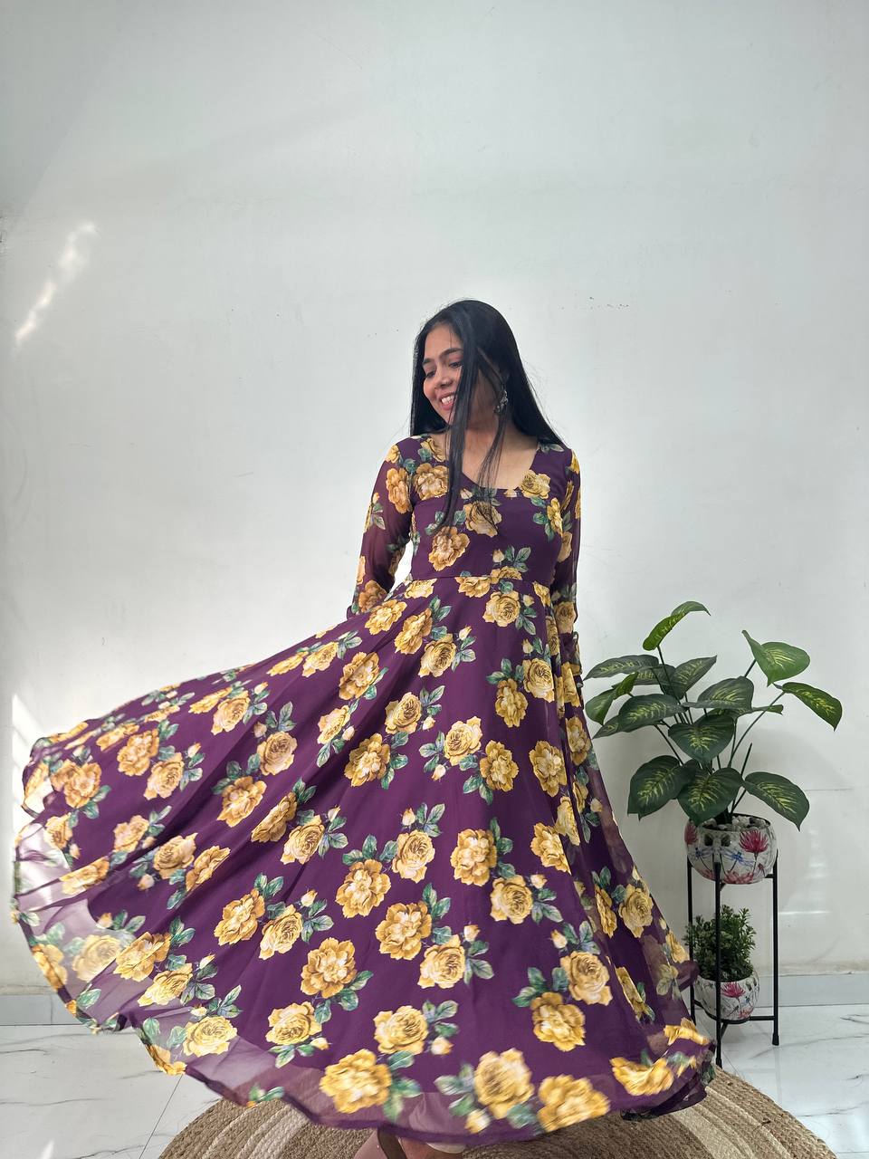 Step into elegance with this beautifully crafted deep purple Anarkali, made from lightweight georgette and adorned with vibrant floral prints. Featuring a delicately detailed neckline, full churidar sleeves, and paired with contrasting white plazo pants, this ensemble is the perfect blend of traditional charm and contemporary style. Whether it’s a festive gathering, party, or any special occasion, this outfit offers unmatched comfort and sophistication...
