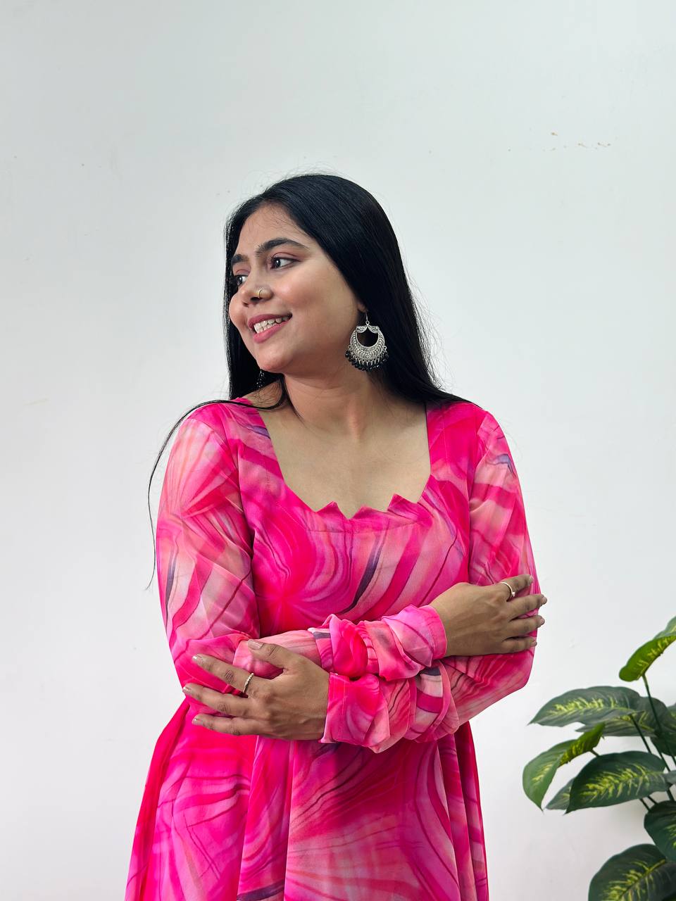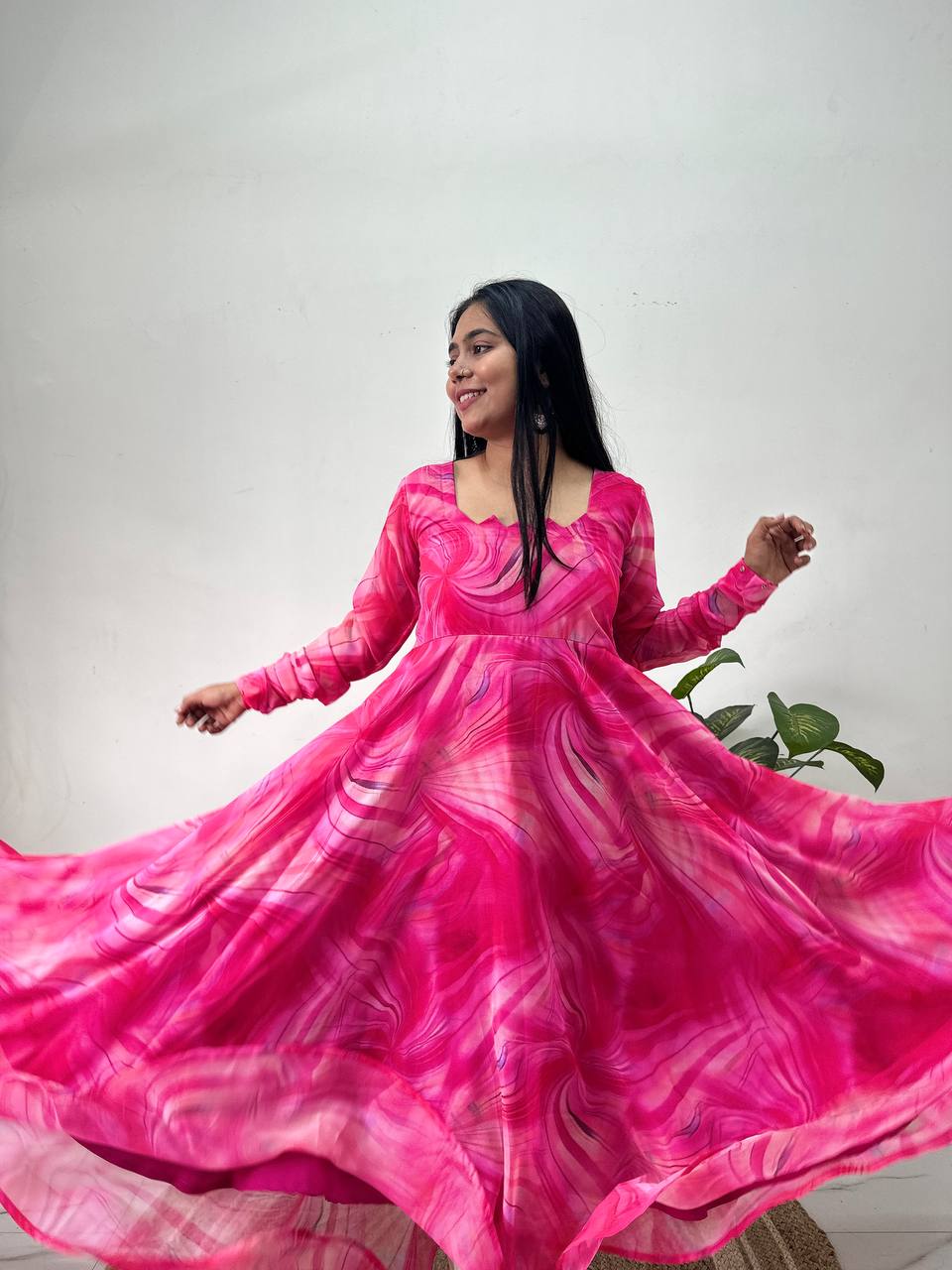 Elevate your style with this stunning pink designer printed Anarkali kurta set. Crafted from luxurious georgette, this piece features vibrant, intricate prints, a detailed neckline, and full churidar sleeves. Paired with classic white plazo pants, it’s the perfect combination of comfort and elegance, making it ideal for festive celebrations, parties, and casual gatherings. Available in all sizes, this outfit promises to add a touch of sophistication to any occasion.