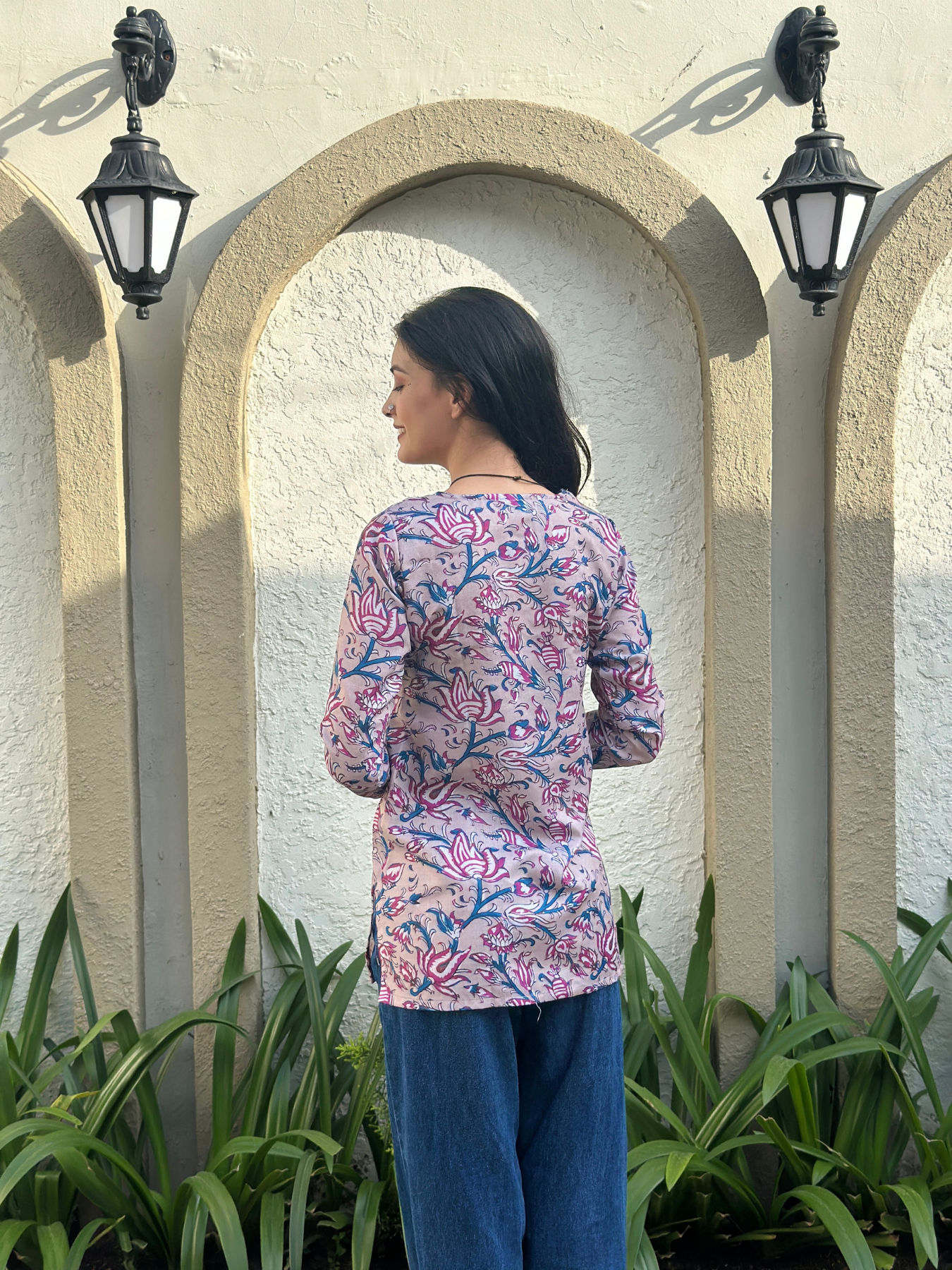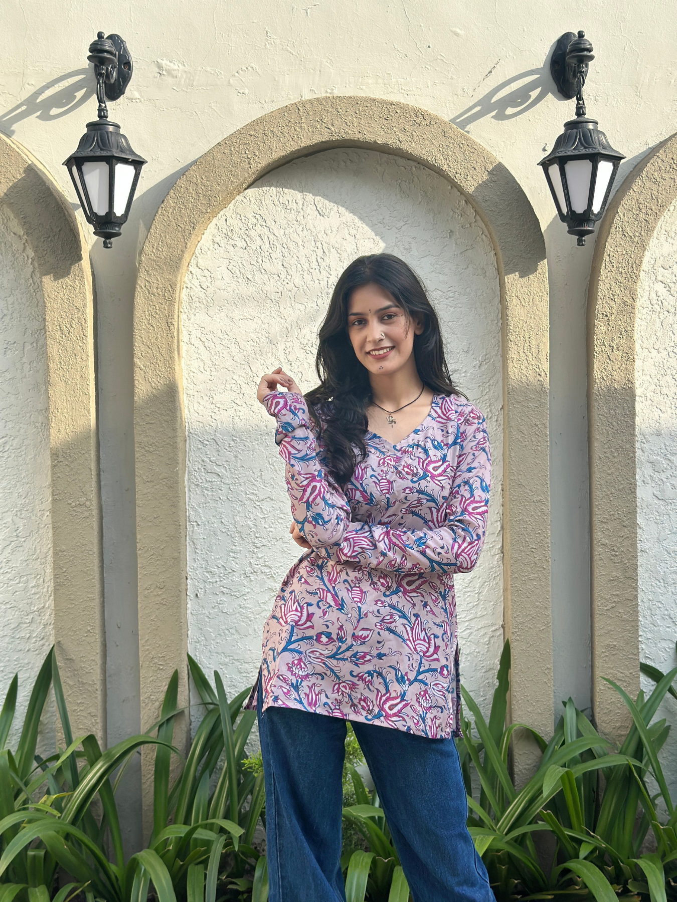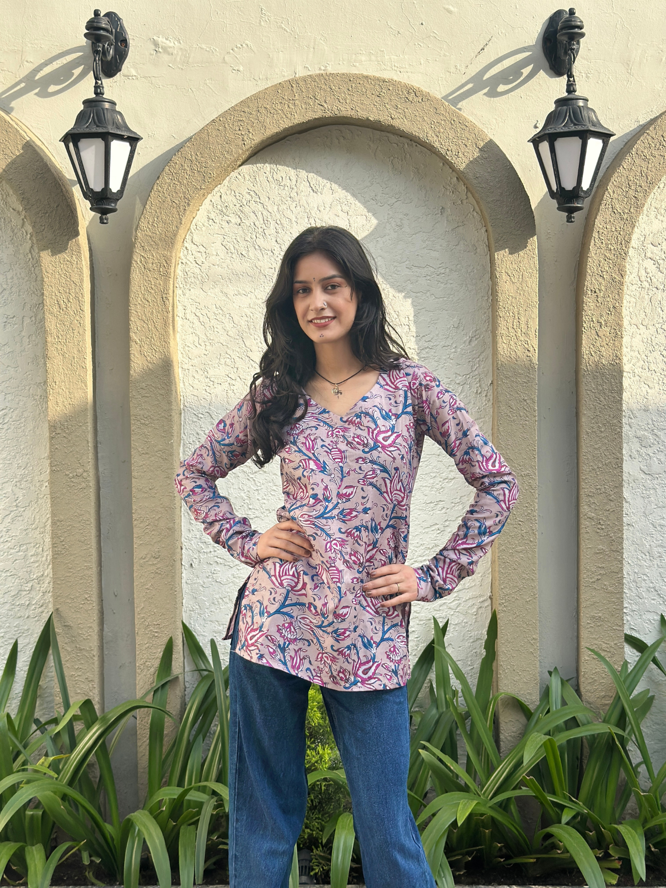 Add a touch of elegance to your everyday wardrobe with this grey cotton short kurti, adorned with delicate floral prints. Made from soft, breathable cotton, it offers all-day comfort along with a chic ethnic vibe. Pair it effortlessly with jeans, leggings, or palazzos for a versatile look that works for both casual outings and office wear.