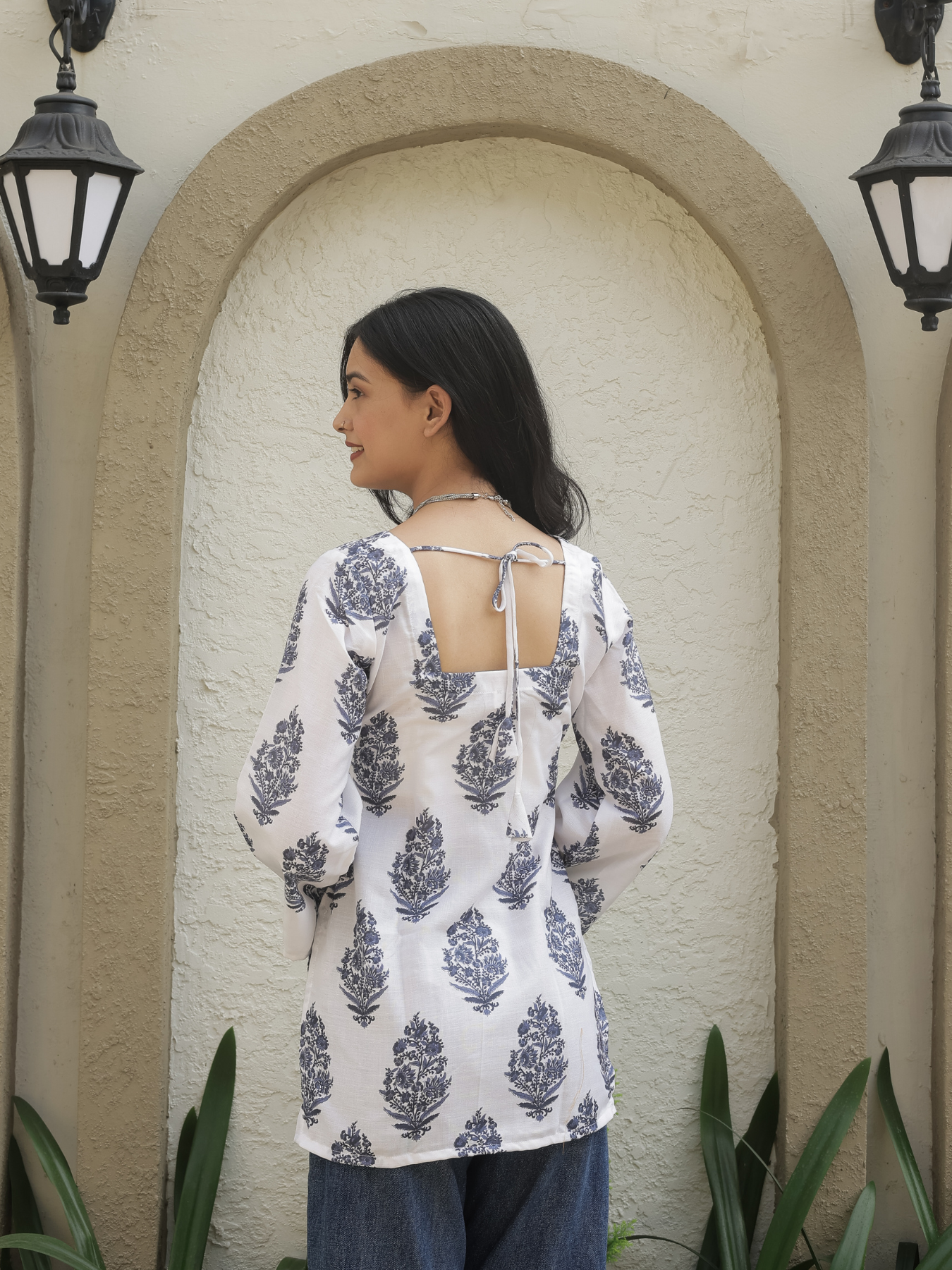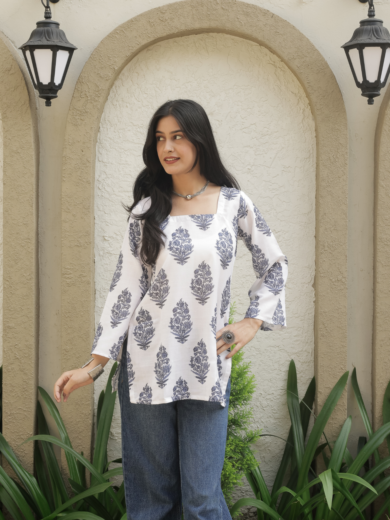 Pearl White Cotton Printed Bell Sleeves Short Kurti