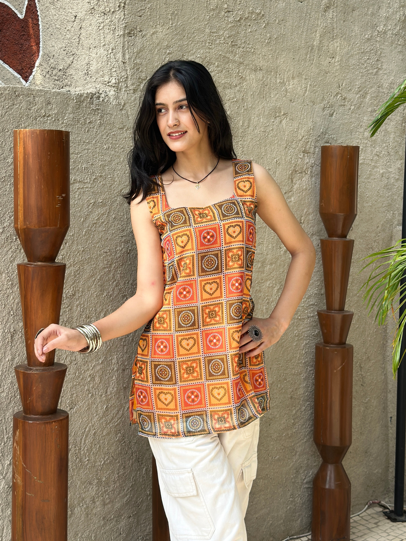 Add a vibrant touch to your ethnic wardrobe with this Rust Orange Sleeveless Short Kurti, crafted from soft and breathable fabric. Featuring a chic sleeveless design and a modern short length, this kurti blends comfort with effortless style. Perfect for festive occasions, casual outings, or office wear, it pairs beautifully with jeans, palazzos, or skirts. The elegant rust orange hue adds a warm charm, making it a versatile pick for every season.