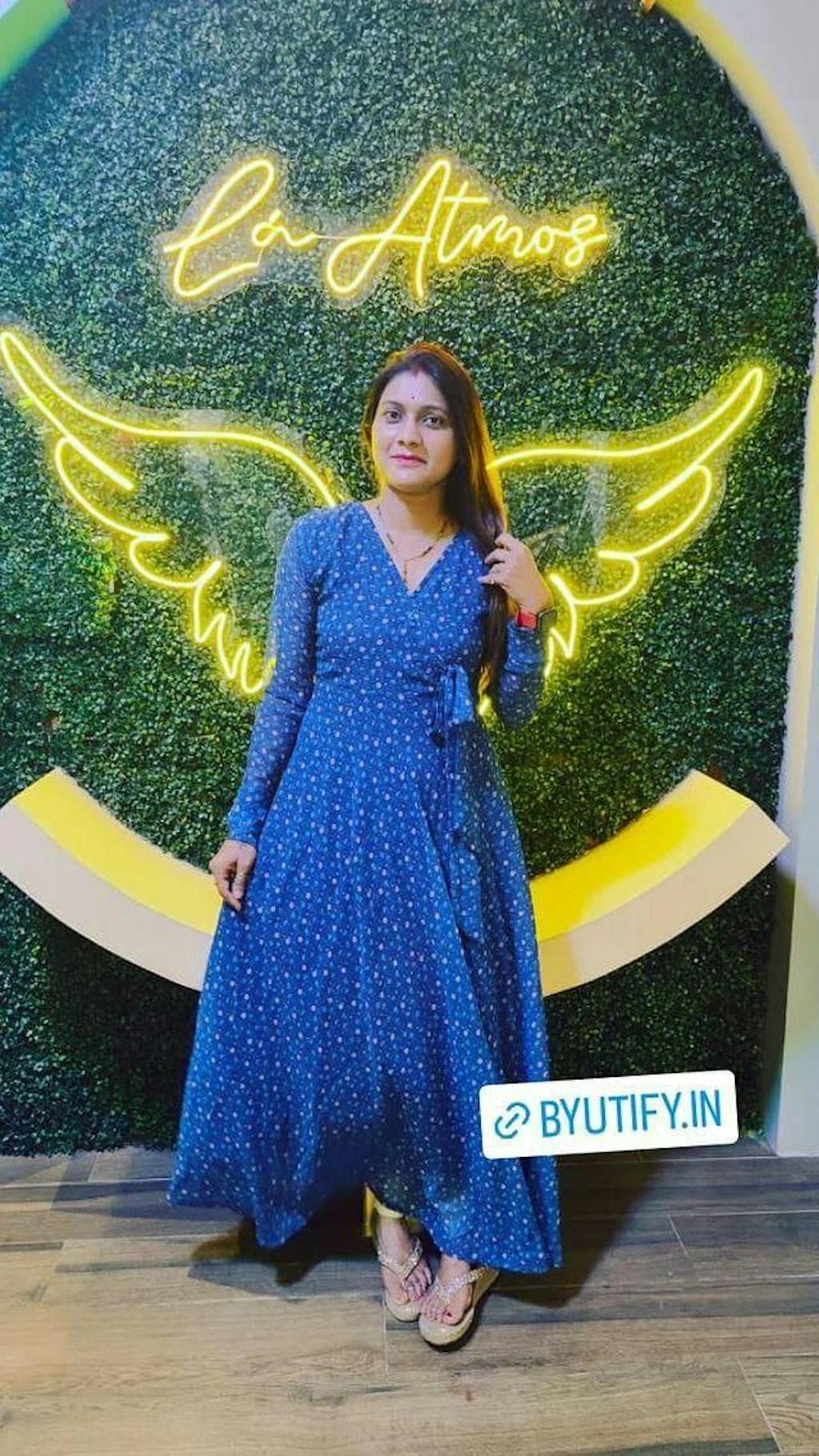 Get a dreamy look for by wearing this trendy gown. This party wear gown is fashioned on georgette fabric & enriched with Beautiful print..