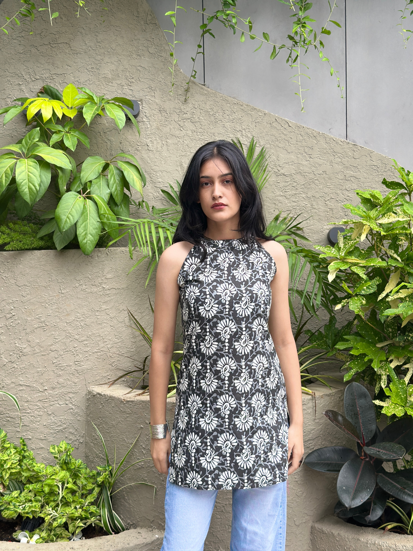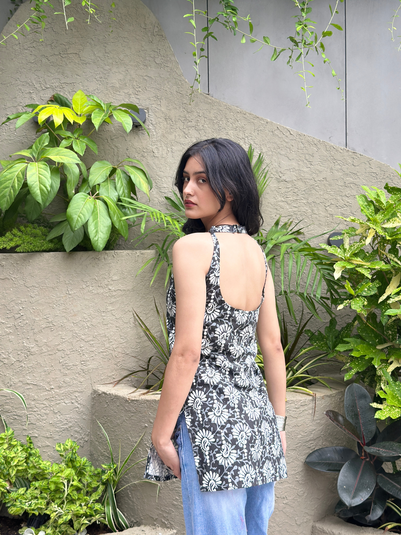 Stay cool and stylish in this black cotton kurti featuring a modern halter-style neckline and chic all-over print.