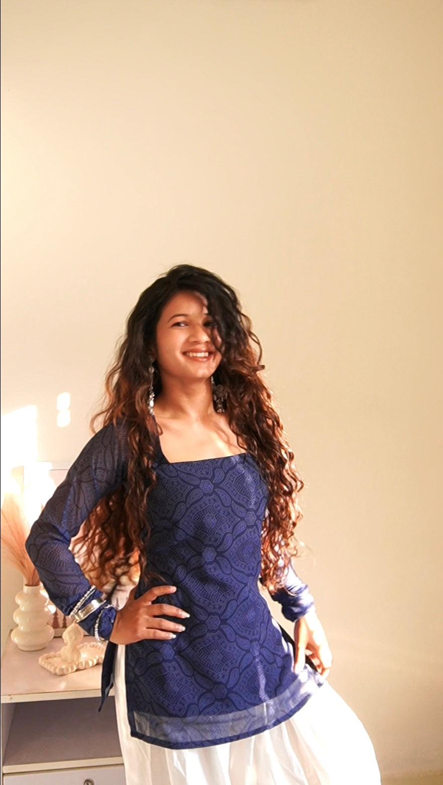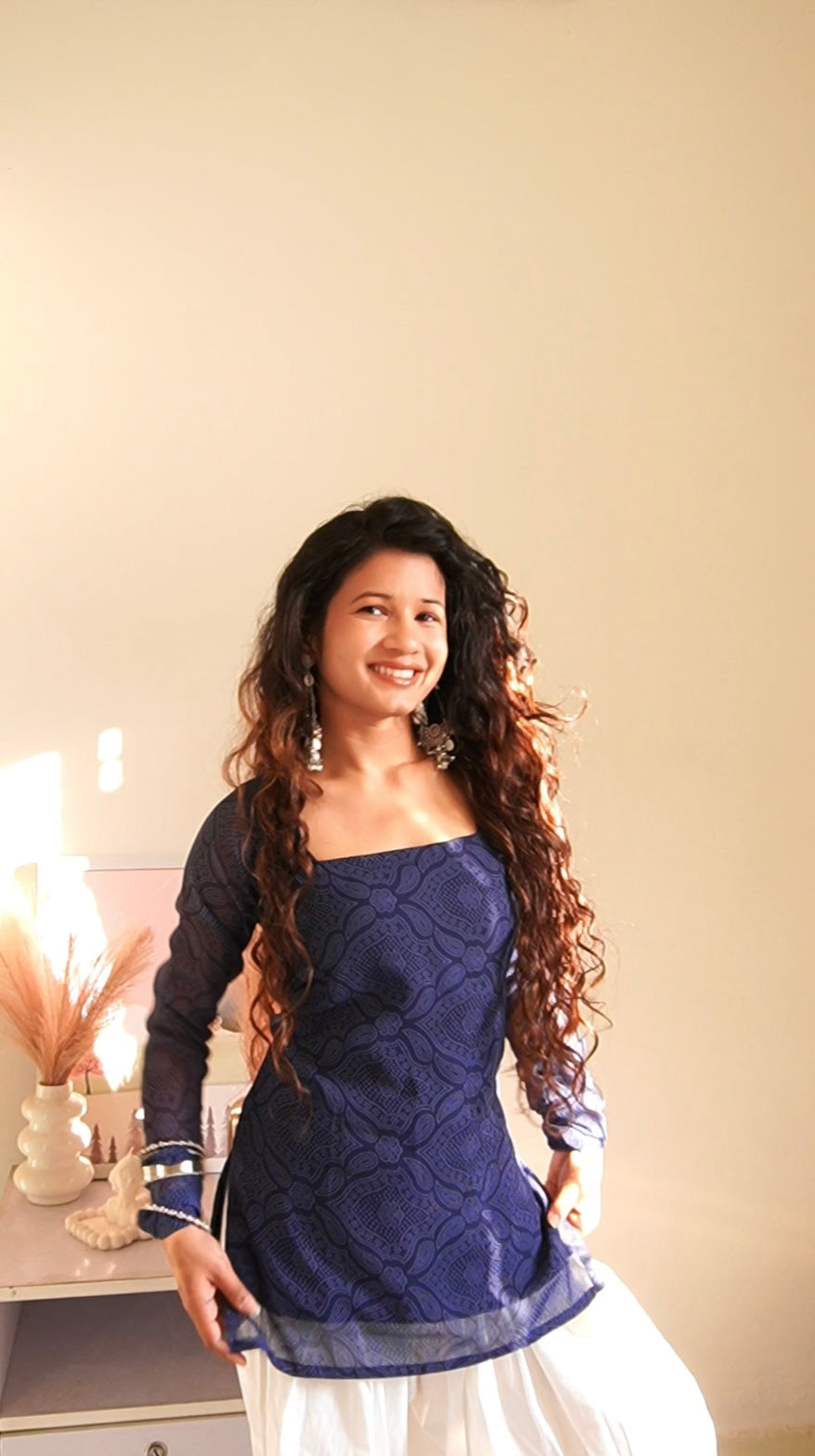 This dark blue georgette kurti features a stylish square neckline and full sleeves, offering a breezy, elegant look.