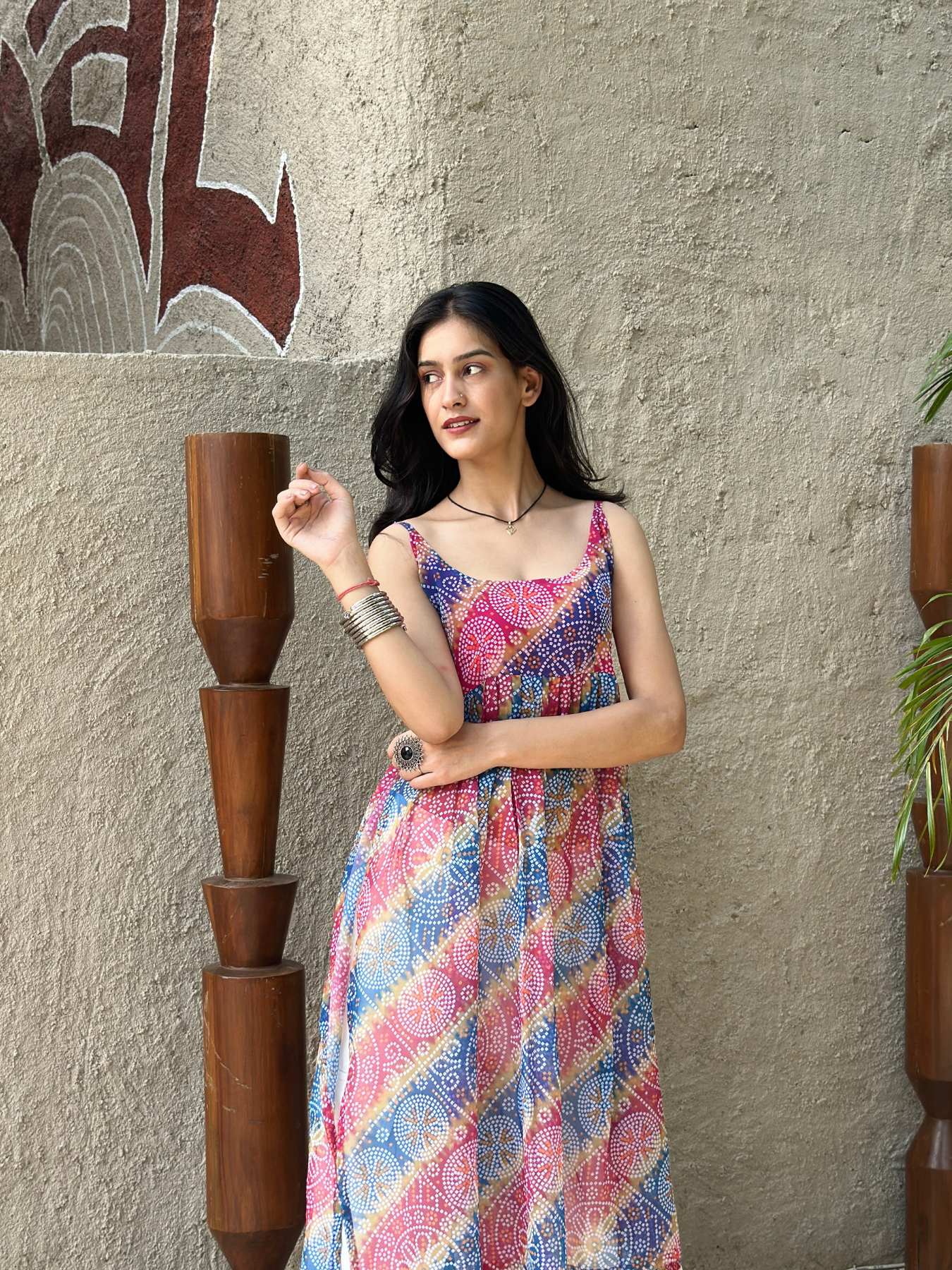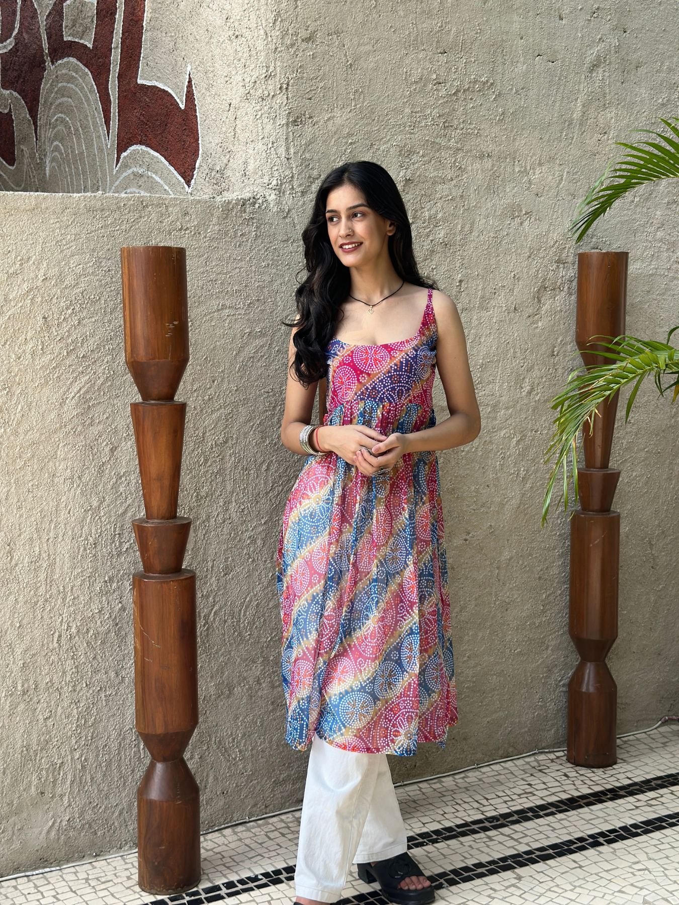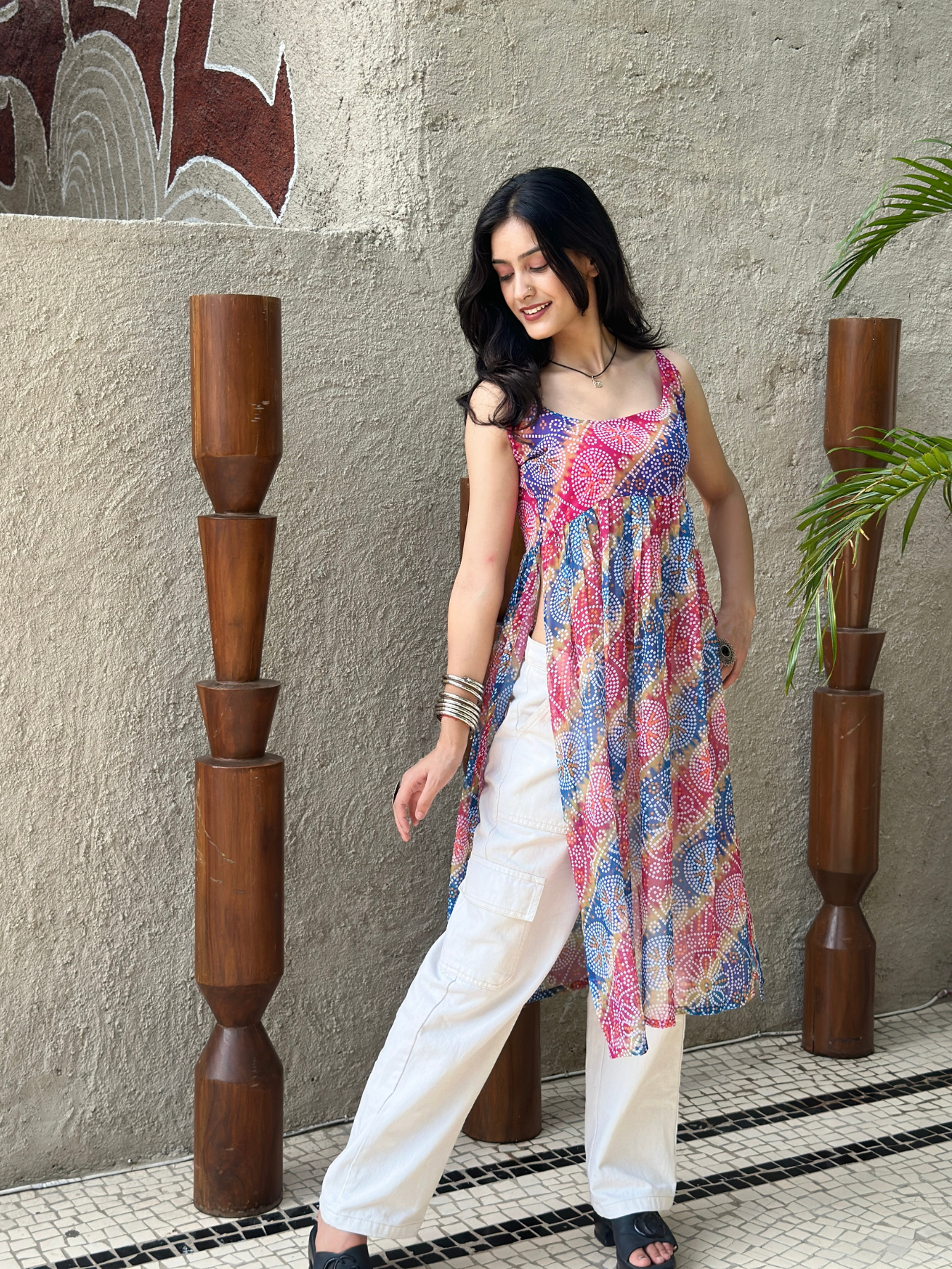 Made from lightweight georgette fabric, this kurti comes with a vibrant multicolor bandhani print. The sleeveless design gives it a stylish and comfortable look, perfect for festive wear as well as casual outings. Pair it with jeans, leggings, or palazzos, and complete the look with jhumkas or simple earrings.