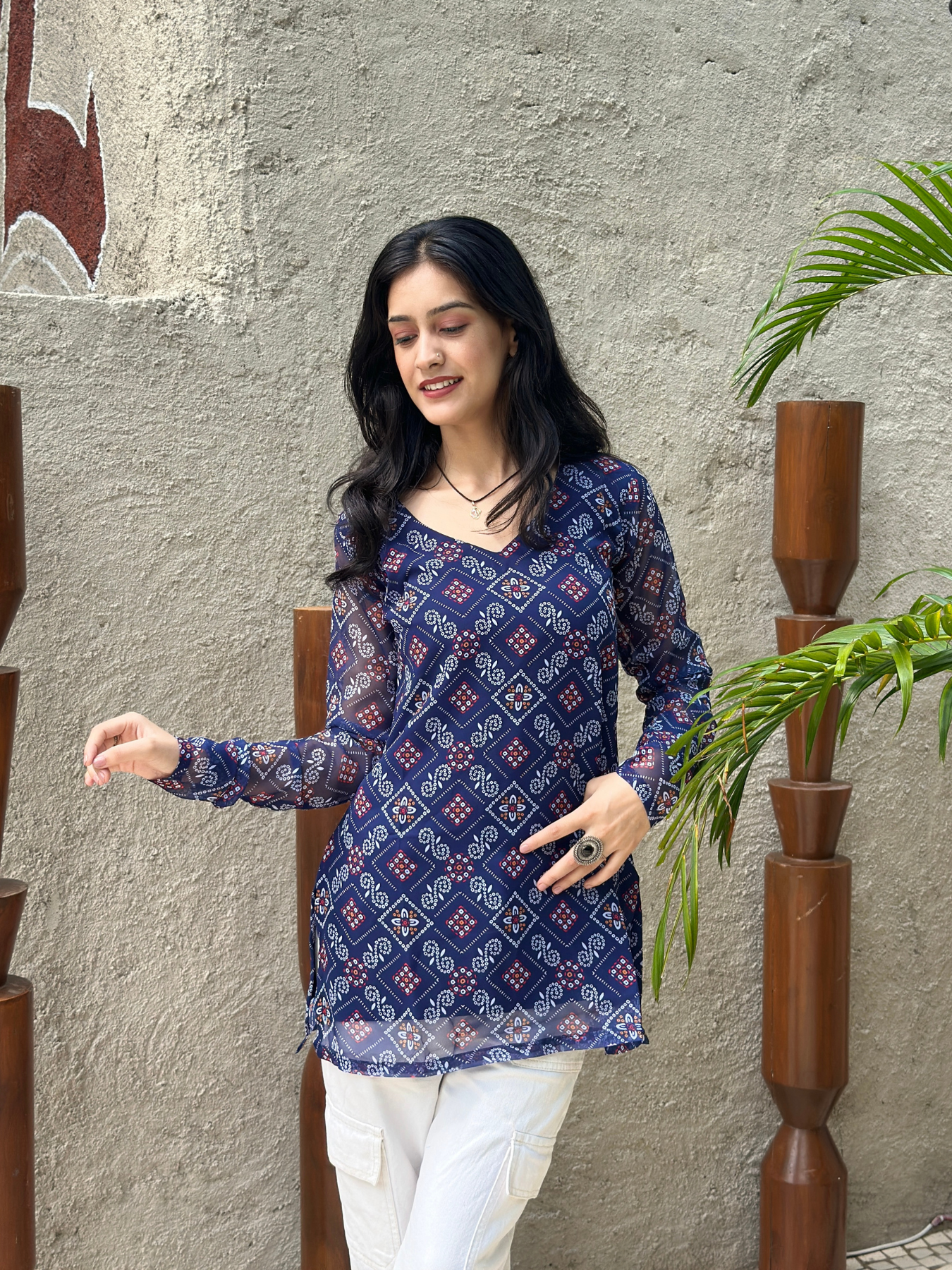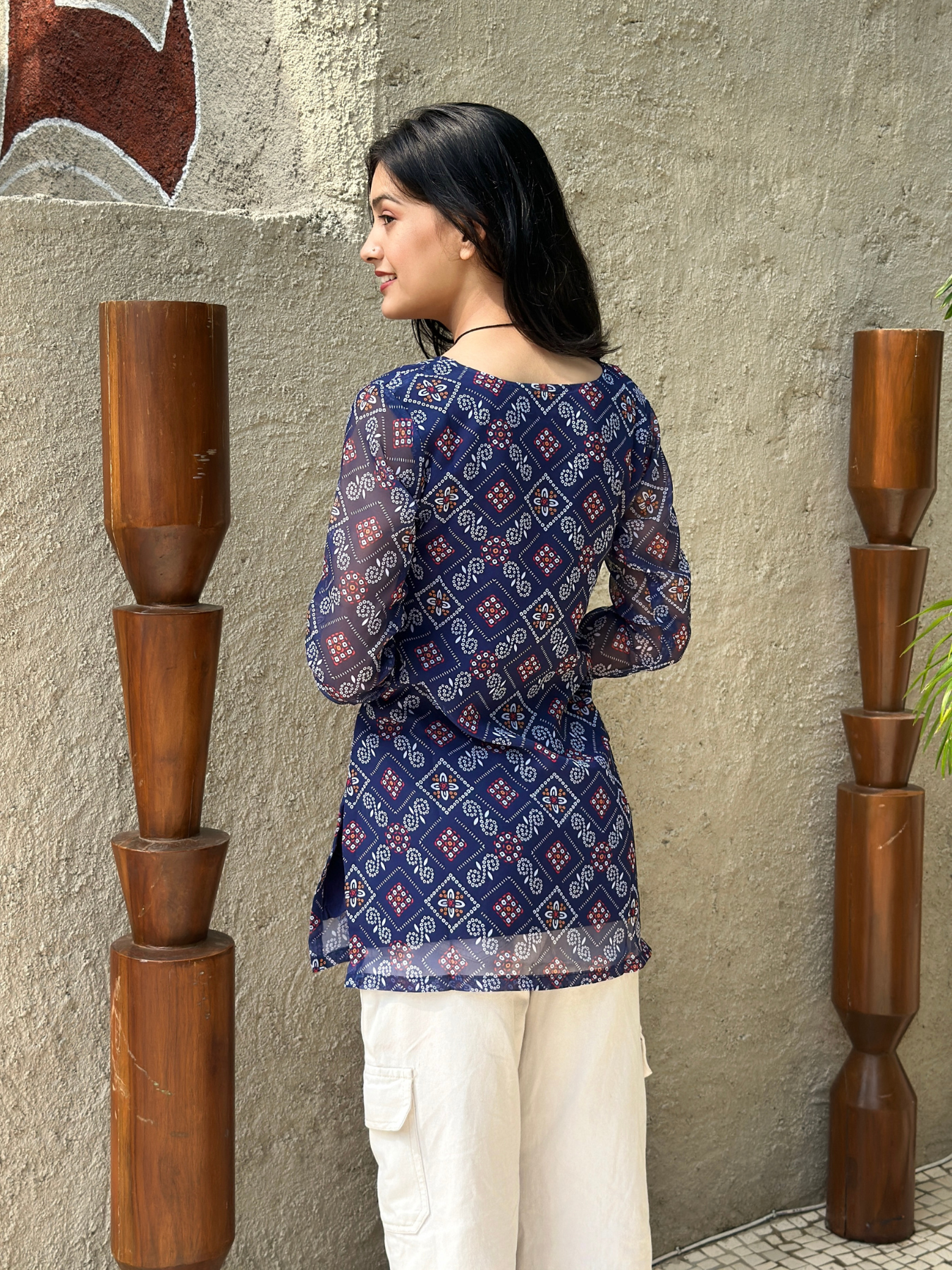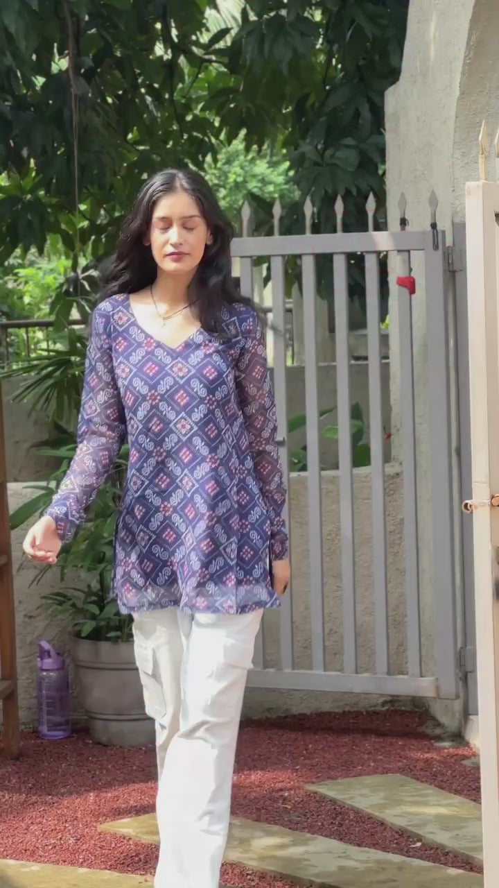 Bring traditional charm with a modern twist in this Navy Blue Bandhani Printed Short Kurti. Made from soft, breathable fabric, it features classic bandhani prints that add a festive touch to your look. The short length and easy silhouette make it perfect for pairing with jeans, palazzos, or skirts. Ideal for casual outings, festive occasions, or everyday wear, this kurti combines comfort and timeless style in one.