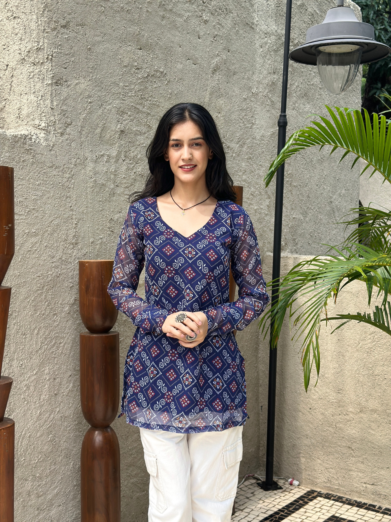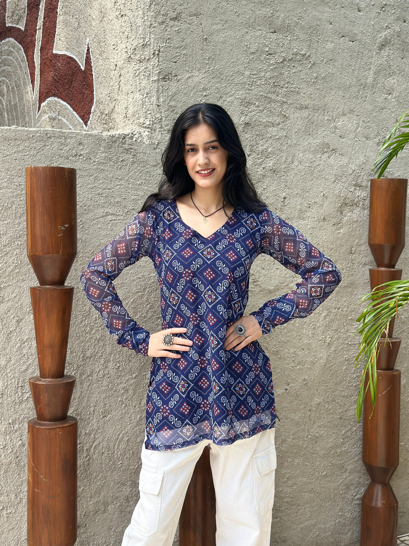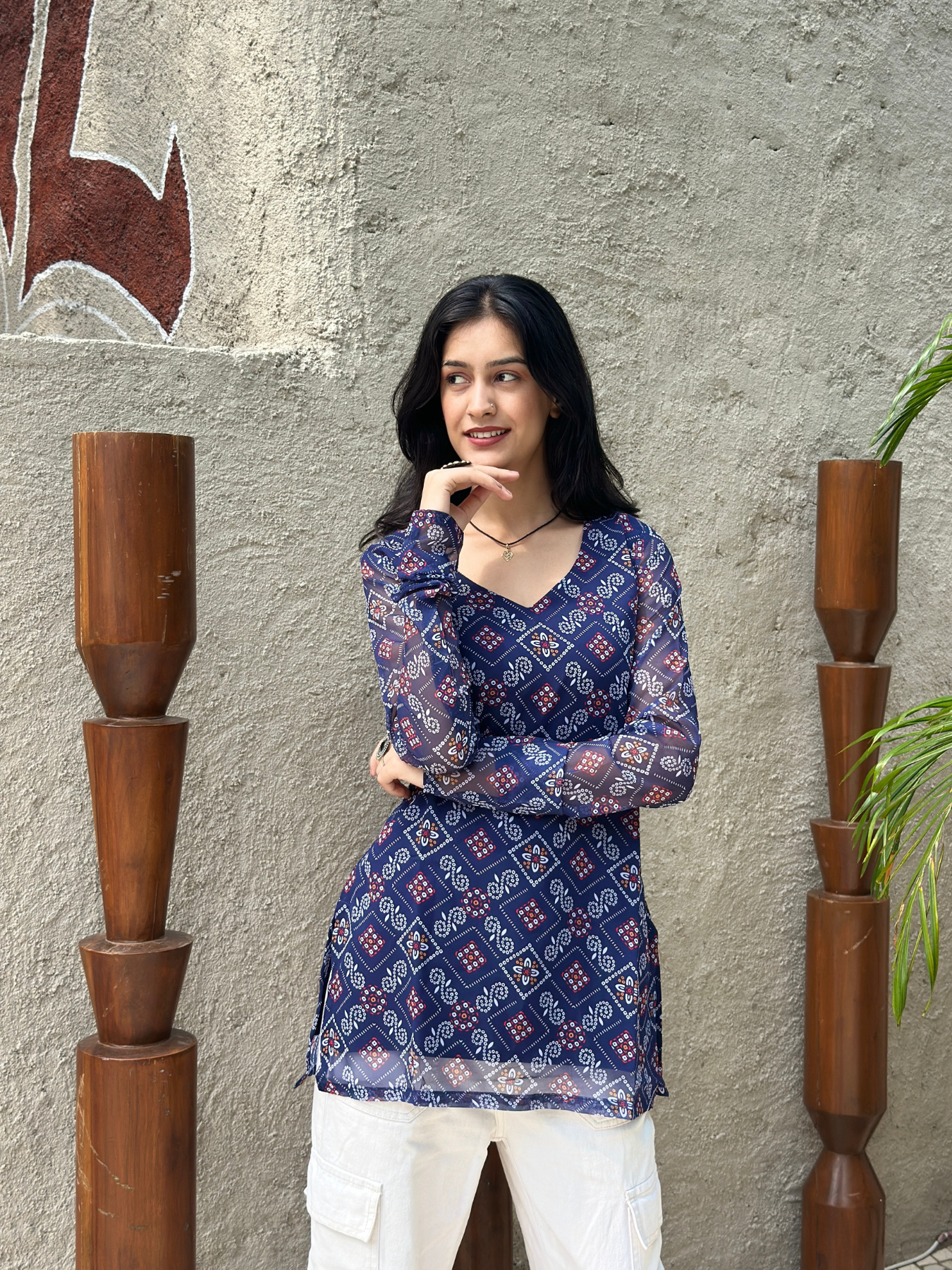 Bring traditional charm with a modern twist in this Navy Blue Bandhani Printed Short Kurti. Made from soft, breathable fabric, it features classic bandhani prints that add a festive touch to your look. The short length and easy silhouette make it perfect for pairing with jeans, palazzos, or skirts. Ideal for casual outings, festive occasions, or everyday wear, this kurti combines comfort and timeless style in one.