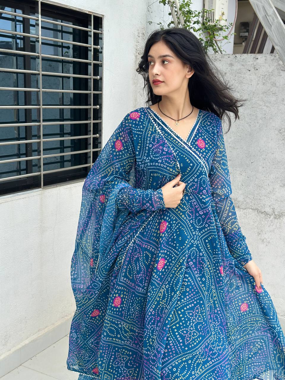 Teal Blue Bandhani Anghrkha style Anarkali Suit Set With Duptta