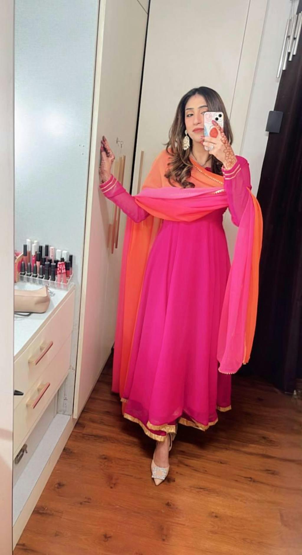Rani Pink Anarkali With Two Tone Dupatta